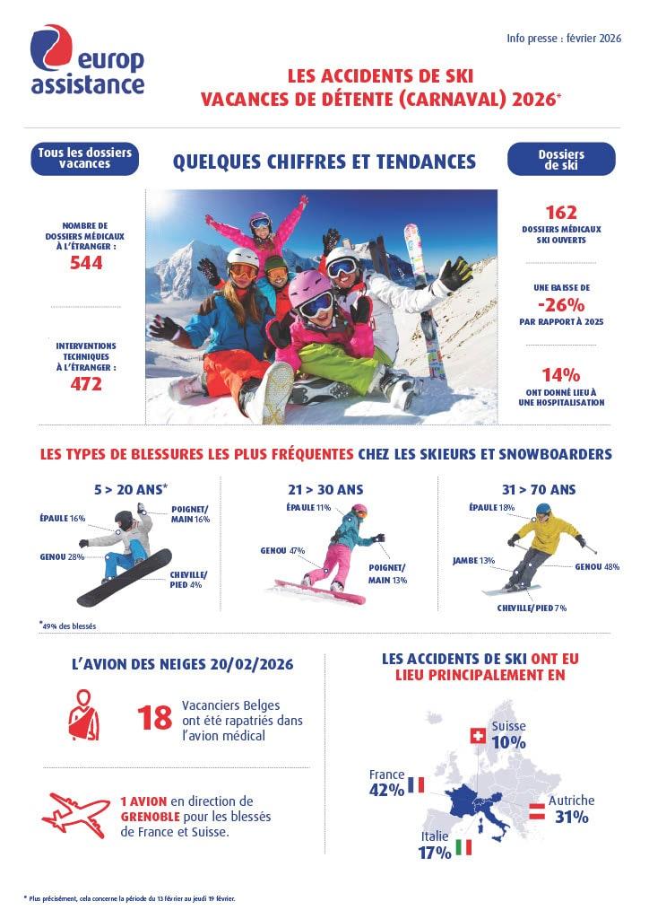 Du vendredi 13 février au jeudi 19 février, Europ Assistance a ouvert un total de 162 dossiers médicaux “ski” dans les Alpes, soit une baisse de 26 % par rapport à le même période de vacances des francophones et néerlandophones en 2025.