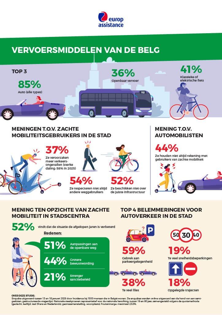 Veiligheid inzake mobiliteit in stedelijke gebieden: De helft van de ondervraagde Belgen (52%) vindt dat de zachte mobiliteit in de steden de afgelopen jaren is verbeterd. 35% is het daar niet mee eens. Degenen die een verbetering opmerken, schrijven dit toe aan de inrichting van de openbare weg (51 %) aan de bewustwording van automobilisten (44 %), aan strengere bestraffing van overtreders (21%) en aan veiligere vervoersmiddelen (20%).