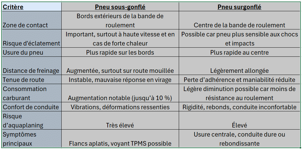 Pour mieux comprendre les différences entre un pneu sous-gonflé et un pneu surgonflé, voici un tableau comparatif des principaux risques et conséquences auxquels vous pouvez vous attendre.